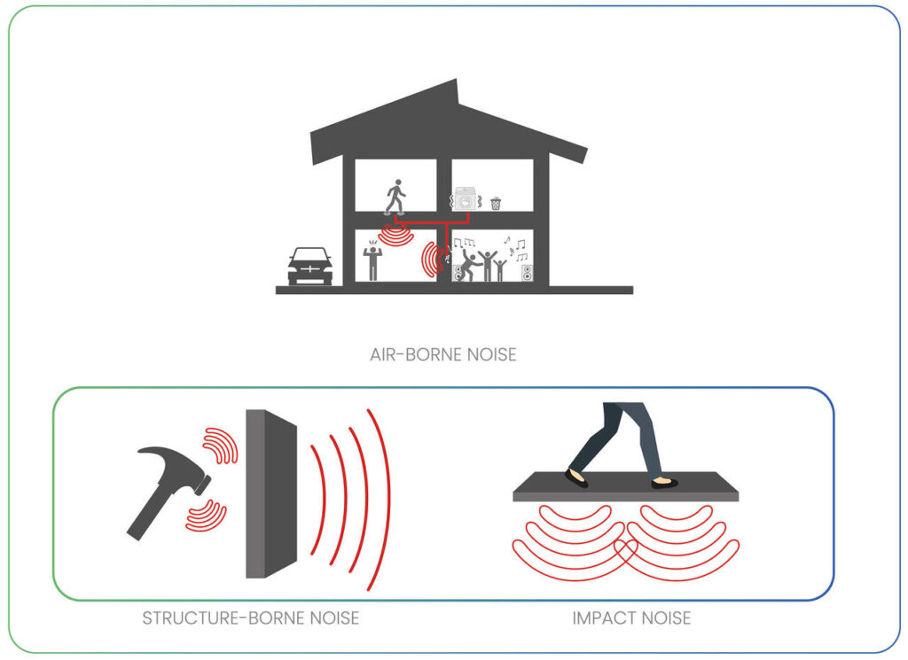 Energi som fortplantar sig genom byggnadens konstruktion. Den kan ofta kännas mer än höras och är en vanlig orsak till klagomål från andra verksamheter eller boende i samma fastighet.