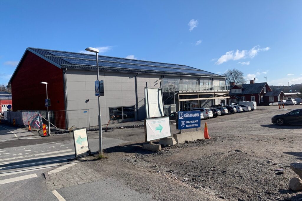 Nya lokalerna i Jungfrusunds Marina, fotade en solig vårdag 2021. Grannlokaler idag inkluderar hotell, restauranger, padelbanor m.m.
